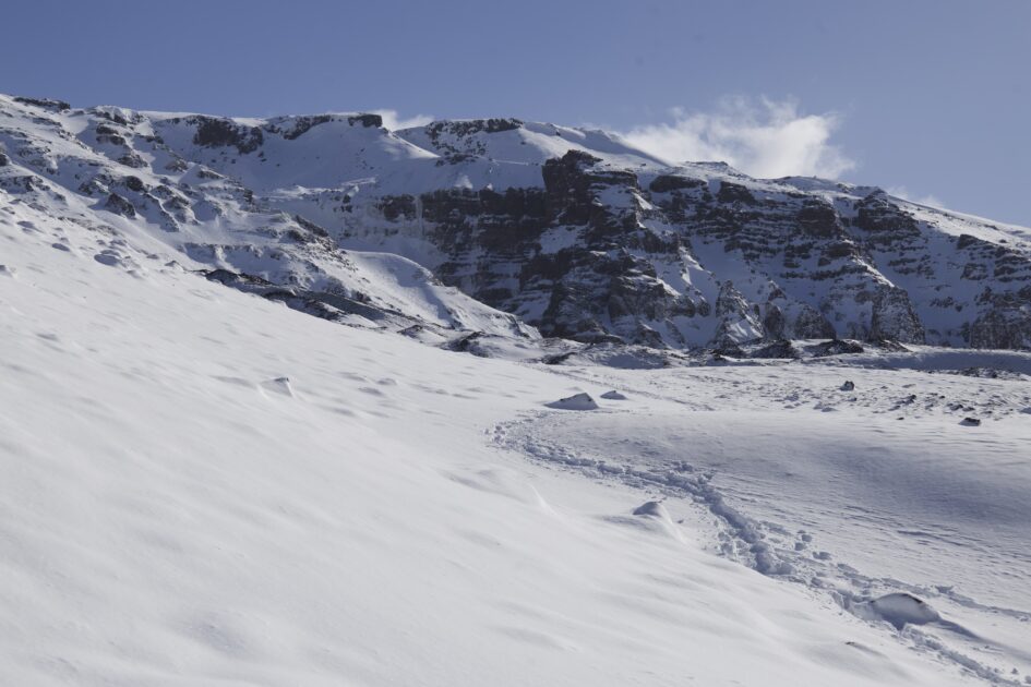 Der Svartifoss hat durchaus etwas Besonderes, denn er stürzt in einem Rund von Basaltfelsen rund 50 Meter in die Tiefe und jetzt im Winter hinein in einen Berg aus Eis.