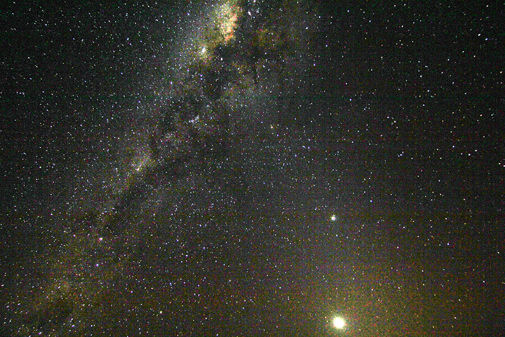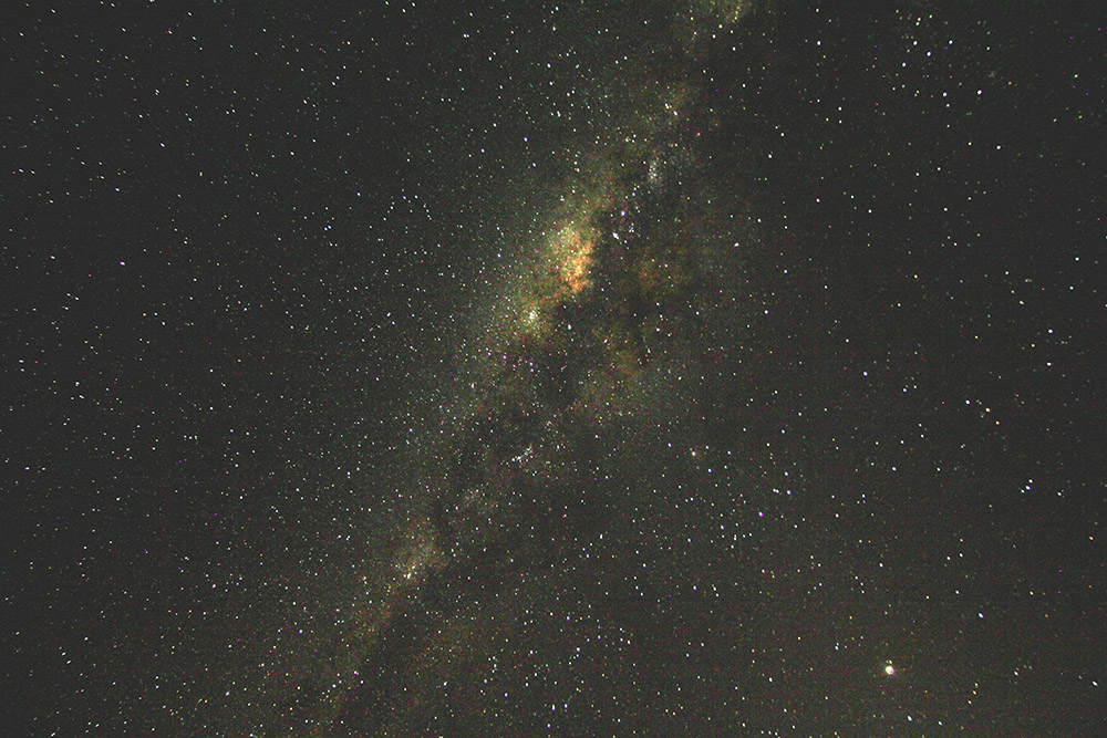 Wir? Na, nicht ganz, für mich war es nun an der Zeit, die Canon auf die selbst direkt am Lagerfeuer unglaubliche Sternenpracht zu lenken. Nach etwa 150 Meter Entfernung stand ich aber mehr oder weniger komplett in der Dunkelheit und knipste, was der Spiegel hergab. Von den rund 200 Bildern werde ich heute mal drei hochladen, dies sind aber auf die schnelle mit PS bearbeitete jpegs, d.h. die wesentlich aufwändige – und ergenbisreichere – Bearbeitung der RAW-Aufnahmen werde ich vornehmen, wenn wir wieder zu Hause sind, aber ich denke, für einen ersten Eindruck reicht es schon.