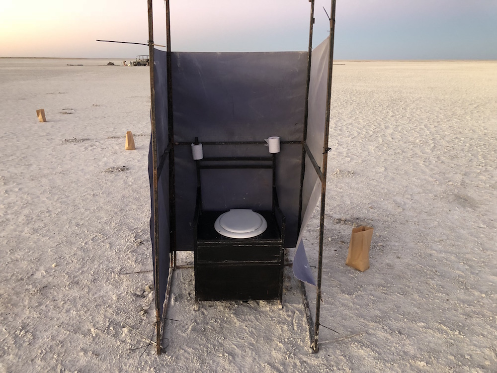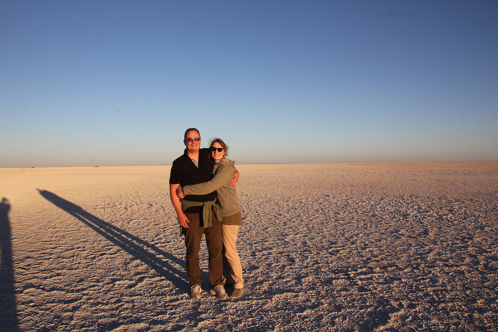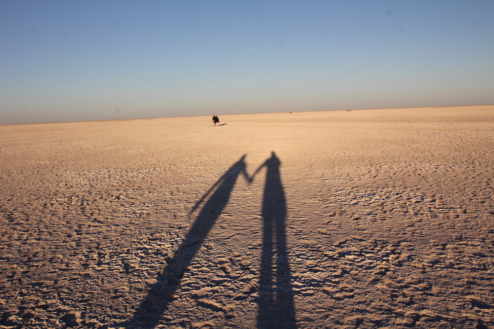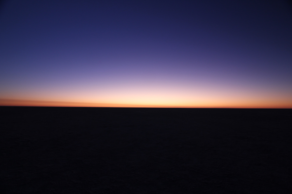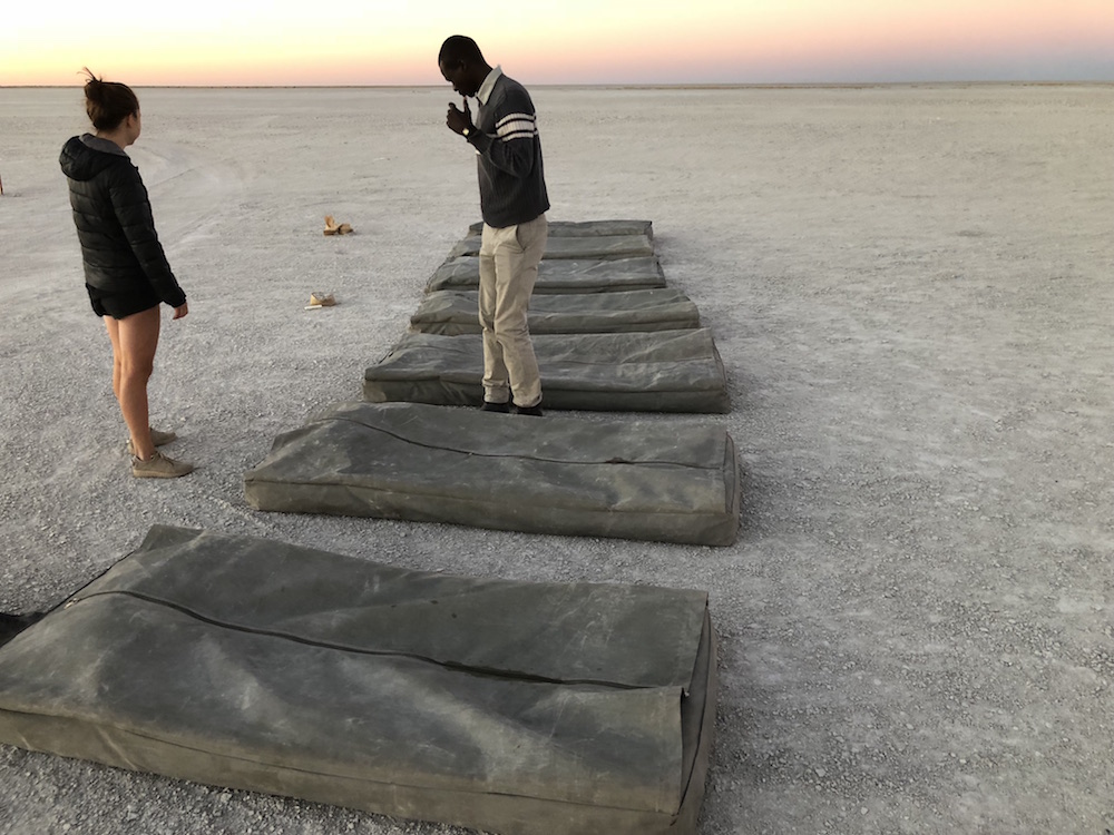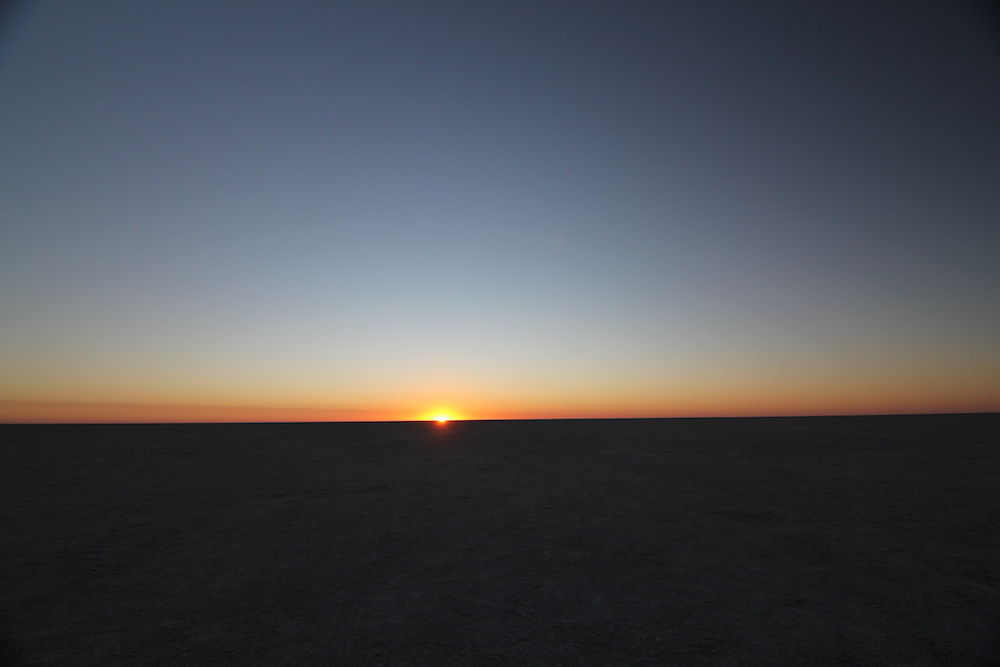 In der Einöder der Salzpfanne angekommen, ging es nach ein paar einleitenden Worten und Besichtigung des Schlafplatzes – sieben nebeneinander liegende Schlafsäcke – zunächst ein mal ans Feuer, von wo aus wir den Sonnenuntergang beobachten konnten.